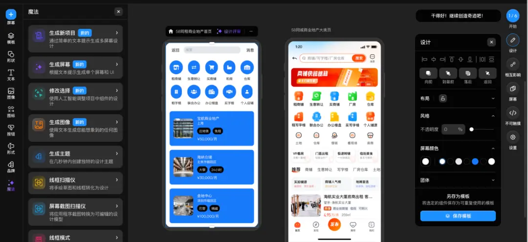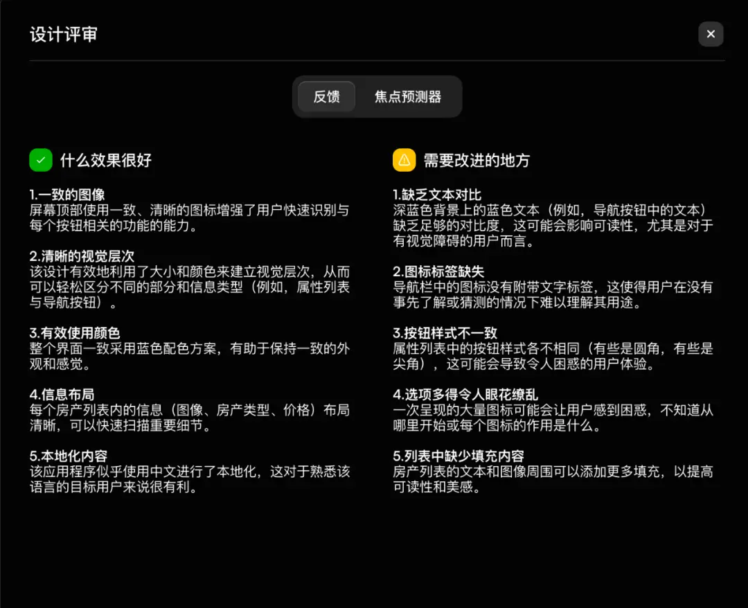 既然 AI 已能通過文字直接生成圖片,卻仍無法獨立完成專業的 UI 界面設計,核心原因在于其在理解復雜業務邏輯、創造性表達與情感傳遞上存在天然局限性,這也讓我們清晰認知到 AI 并非萬能。蘭亭妙微 UI 設計公司在實踐中發現,AI 雖能針對設計中的顯性問題,為優化工作提供數據化的專業建議,但在深層設計維度仍有明顯短板。以 58 同城商業地產頁面設計稿的評審工作為例,AI 可精準識別設計中的亮點與待優化點: