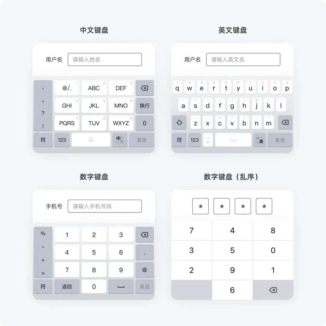 為了簡化數據輸入,滿足不同的類型的文本輸入需求,用戶在輸入不同類型的字段時,應提供對應類型的鍵盤,便于用戶更快完成表單內容,常見的鍵盤有以下幾種: