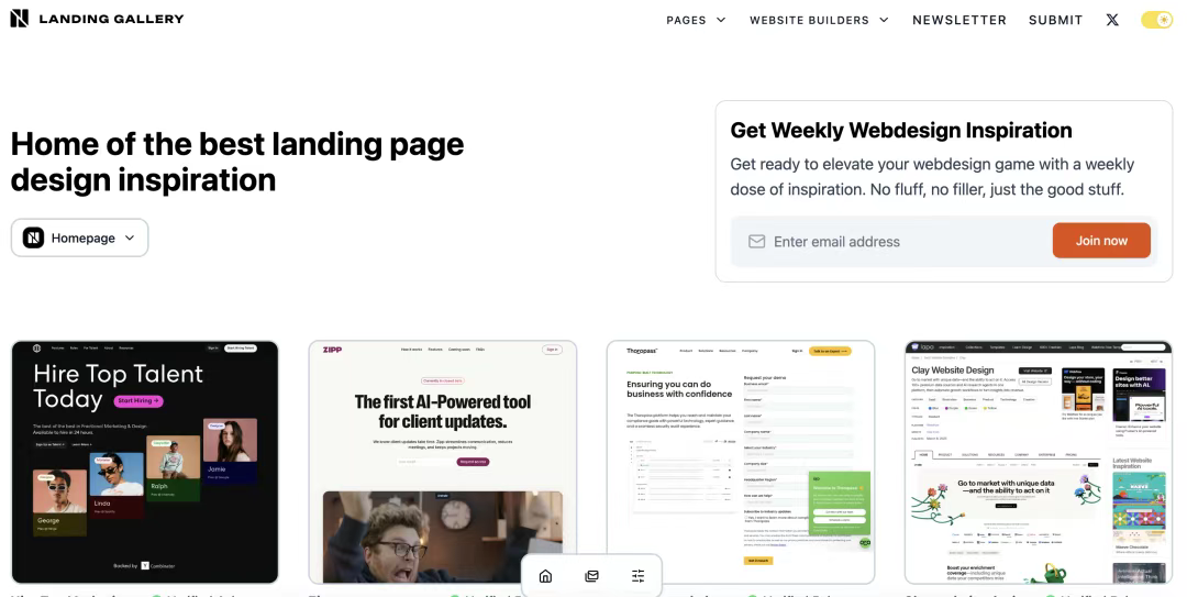 [Landing Gallery](http://landing.gallery) 專注于提供各個領域的著陸頁設計靈感。無論你需要設計什么類型的頁面,從主頁、定價頁面到聯系頁面,甚至是404錯誤頁面,這里都能找到優質的參考案例。