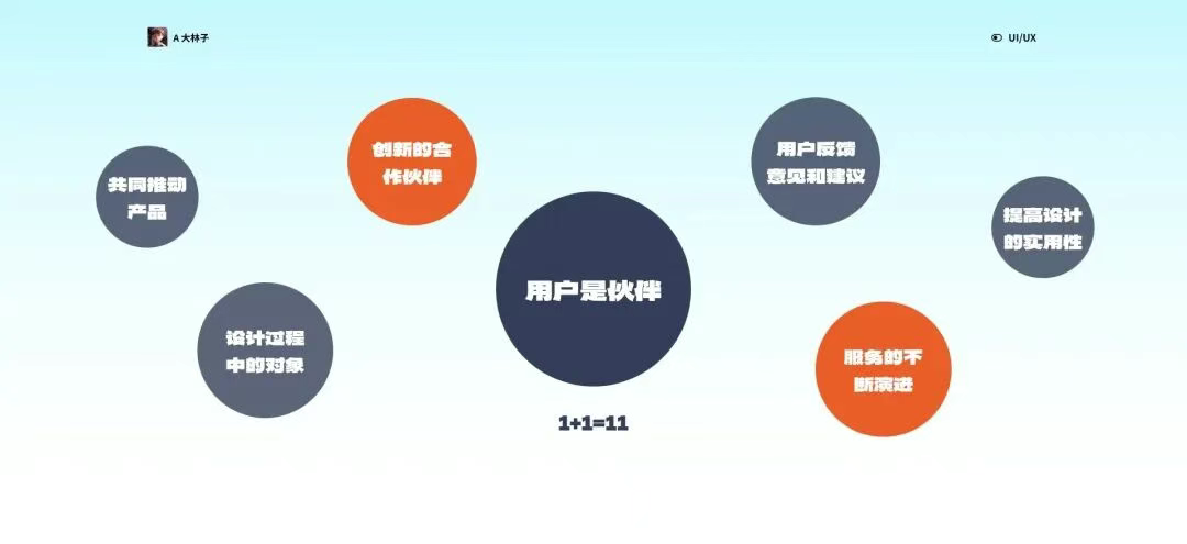 4. 明確4:用戶是伙伴:「1+1=11」 「以用戶為中心」的設計理念將用戶視為產品設計的伙伴,強調用戶參與的重要性。這不僅是在產品的使用中,更是在產品的設計過程中,通過用戶的參與,設計團隊能夠獲得更為豐富的創意和反饋,實現「1+1=11」的效果,將用戶的力量與設計團隊的智慧相結合,創造出更為卓越的產品體驗。