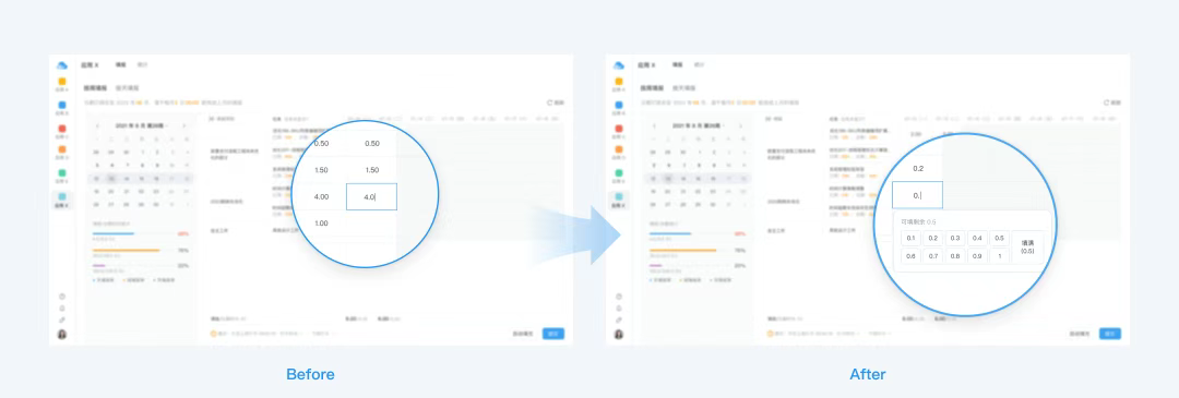 在此之前,我們的工時填報頁面,由于可輸入信息精確到小數點后兩位,所以我們常用的計步器、選擇器、滑動輸入等組件都無法在這里使用。對用戶而言,手動逐項錄入數據的操作成本非常高。