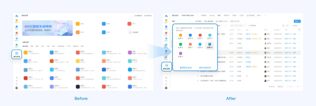 在我們的平臺上,一些用戶雖然可以將自己經常使用的應用常駐到菜單欄上,但是受限于屏幕尺寸左側的菜單欄不能顯示太多常駐應用。