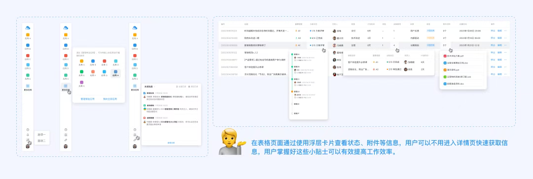 • 在表格頁面通過使用【浮層卡片】查看狀態、附件等信息,用戶可以不用進入詳情頁快速獲取信息,用戶掌握好這些小貼士可以有效提高工作效率。