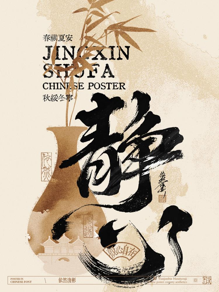 • 行楷的溫潤:圖 7 “靜” 海報中,行書的婉轉筆鋒搭配水墨暈染,把 “寧靜自在” 的意境揉進筆畫的起承轉合里,讓觀者從字形中感受到松弛。