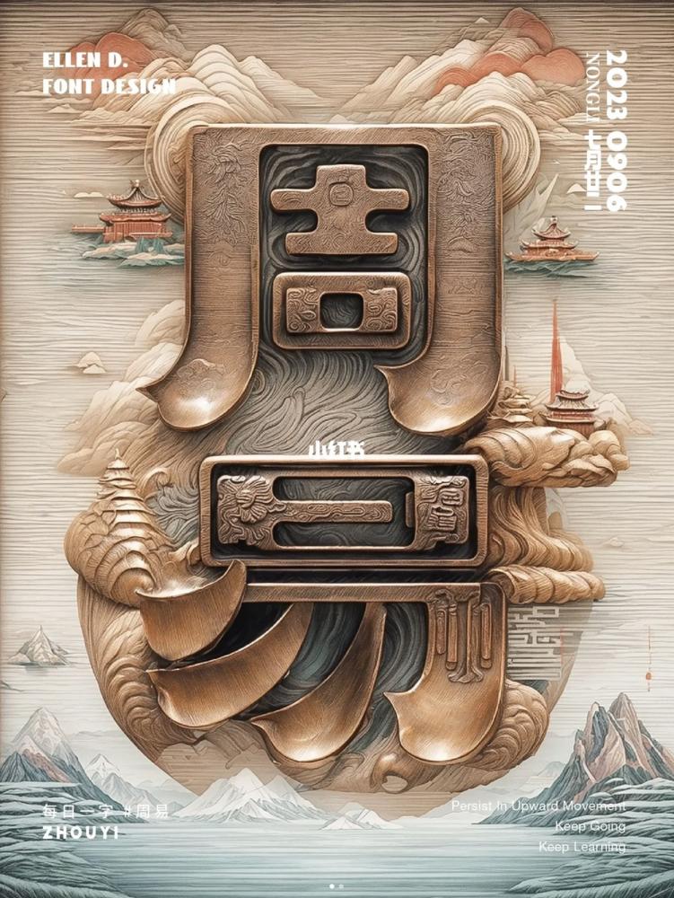 • 立體塑形:圖 1 “周” 字海報,將書法轉化為浮雕質感,搭配背景的山水樓閣,讓平面海報生出 “中式器物” 的空間縱深感;