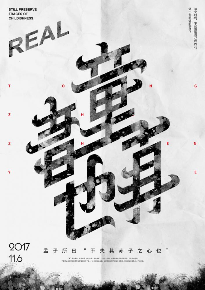 • 虛實疊加:圖 8 “童真” 海報,把書法字體與英文單詞(“ZHEN”)拆分融合,水墨肌理的實與文字拆分的虛形成對比,讓 “赤子之心” 的主題更有設計張力。