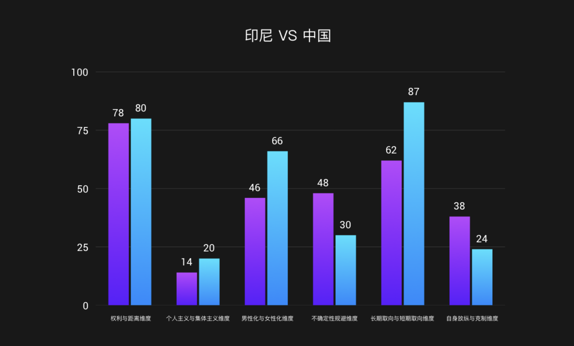 長期取向與短期取向維度是指“ 人們對時間的基本取向“,長期取向的國家更多會著眼于未來的長期目標,而短期取向國家的人們認為活在當下更實際。在這個維度中,印尼分數是 62 分,中國 87 分,屬于長期取向國家。