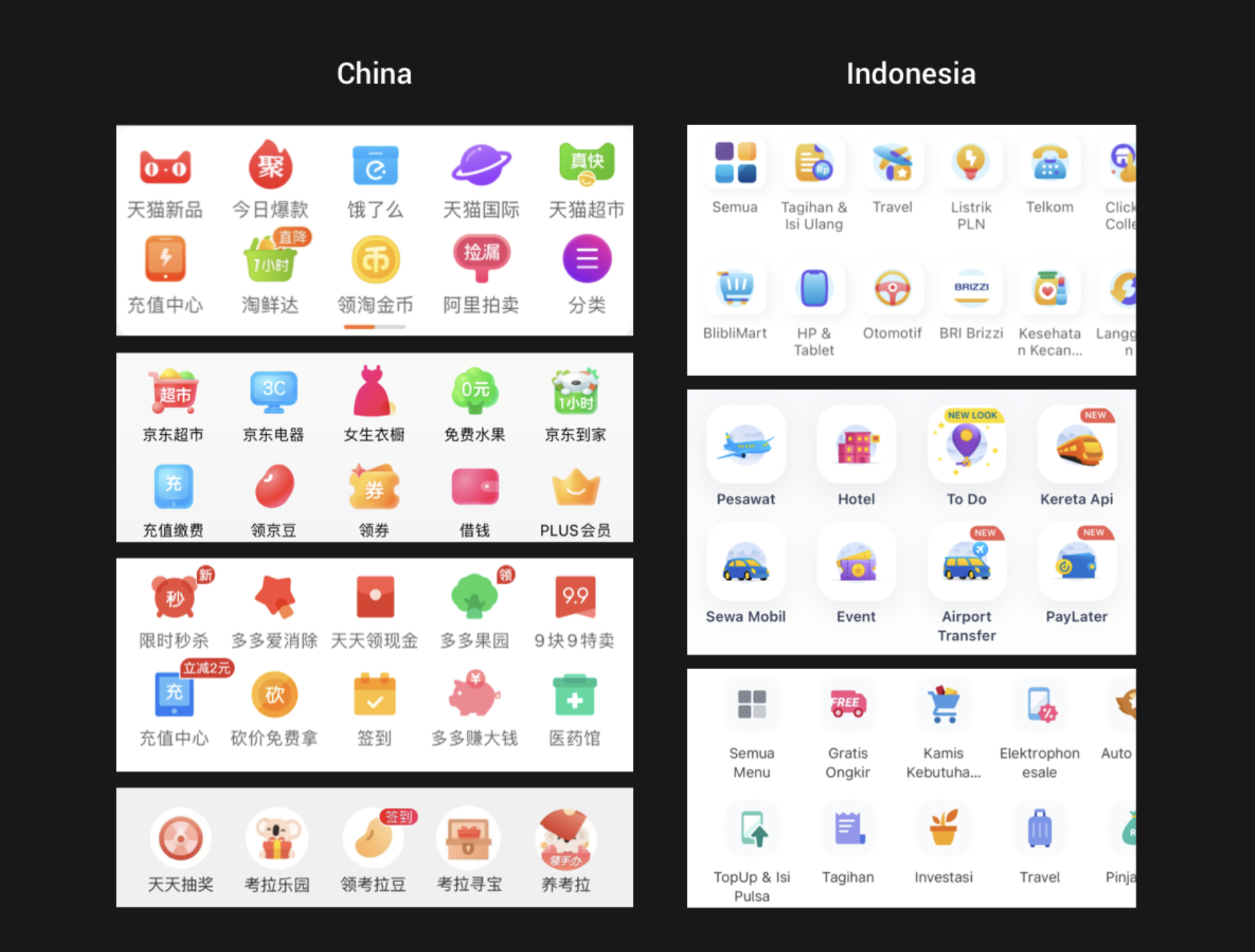 與中國主流的幾家電商平臺相比,印尼的金剛區圖標在細節和色彩的處理上更加豐富。如下圖所示,中國的圖標色彩比例大部分是:90%的主色+10%輔色;而印尼的圖標色彩比例是:70%的主色+30%的輔色。