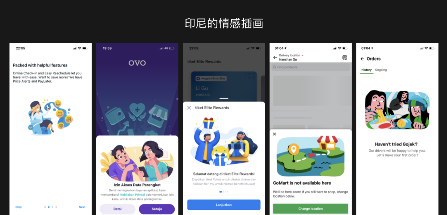 截了幾大主流 APP 的部分插畫場景,都是采用的扁平或 3D 風格。在 hofstede 的文化維度研究中,印尼是集體主義國家,集體主義國家在創作上喜歡用生活常見的生活符號來傳遞深層的含義。比如下圖中的引導和缺省頁場景,引導的同時也運用了生動有趣的生活上的情感插畫來緩解和安撫用戶的體驗情緒。在設計表現上,插畫的色彩鮮明,高飽合的色彩喚醒度較高,容易把用戶的注意力轉移到畫面上來,且插畫都是圍繞一個故事性的場景來開展,具有很強的觀賞性,從而打造了良好的用戶體驗流程。