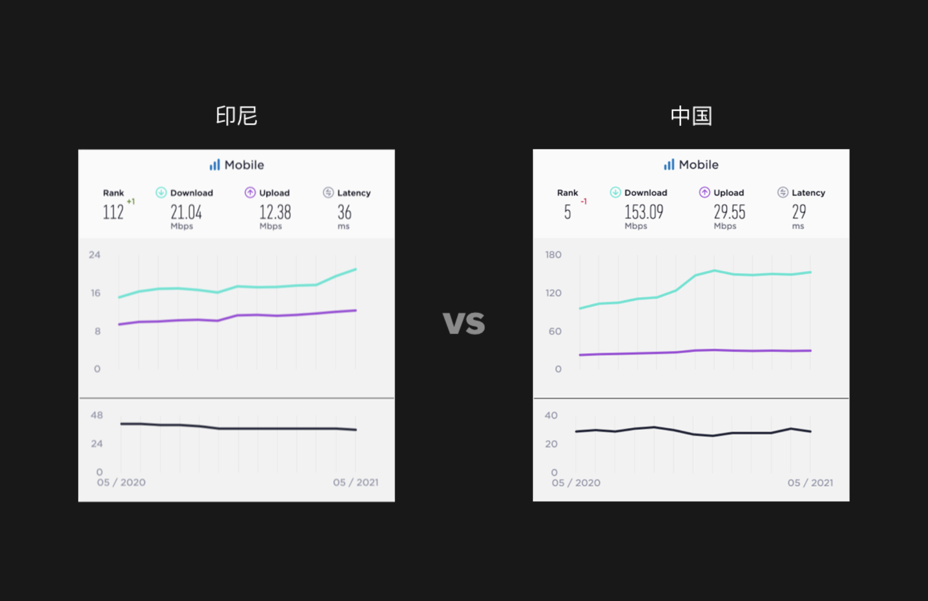 下圖是 2021 年數據,印尼的下載網速 21.04Mbps, 在全球排名 112。中國的下載網速是 153.09Mbps, 全球排名第 5,進行對比后大家對印尼的網絡環境應該更有體感了。