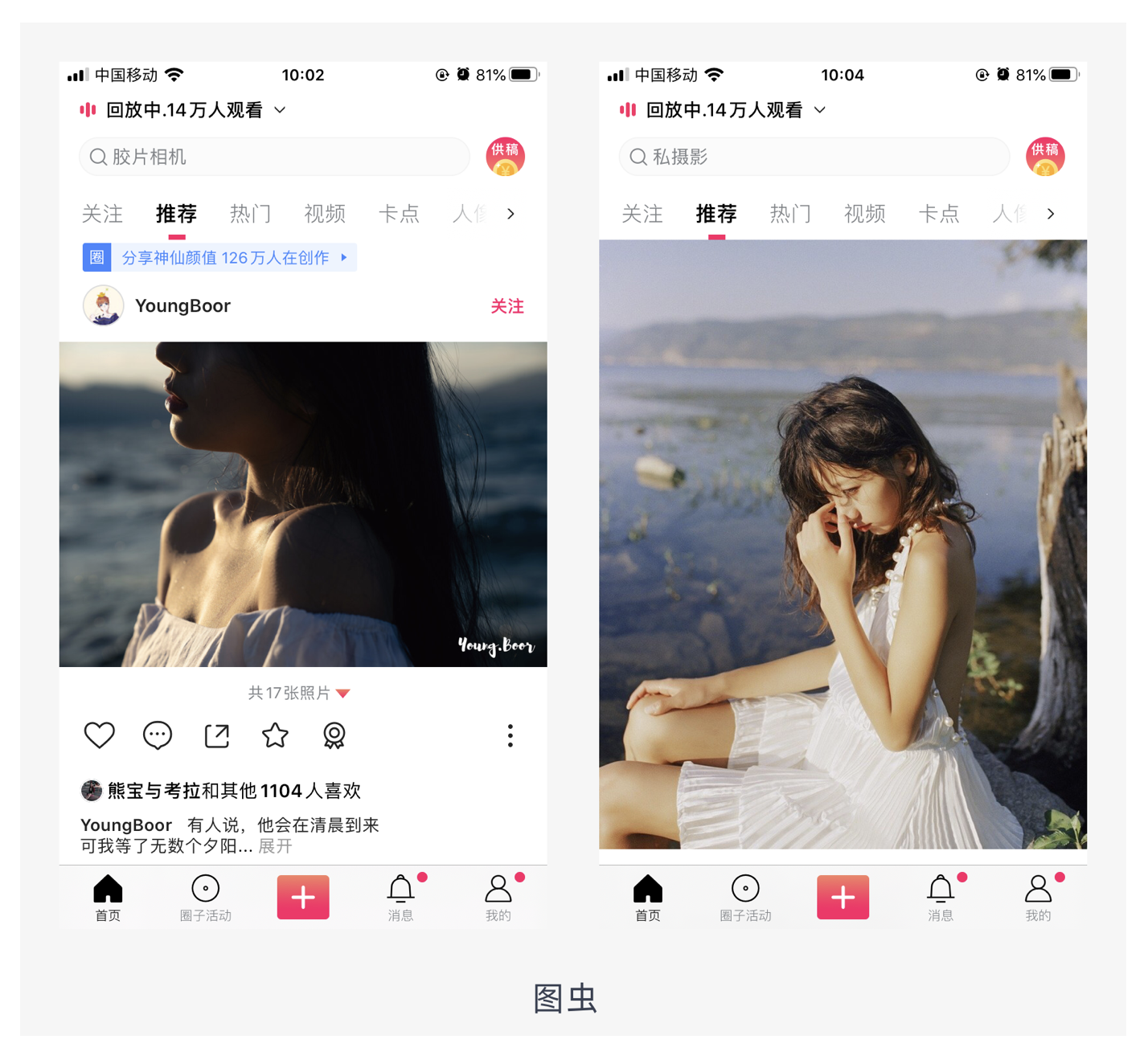 - 隨圖片而變化:當(dāng)用戶上傳不同比例的圖片時,圖片展示寬度為屏幕寬度,展示高度根據(jù)確定的寬度等比例縮放。這種適配方式能將圖片信息表達完善,但圖片占用空間大,適合圖片質(zhì)量高、用戶以瀏覽圖片為主的產(chǎn)品,如圖蟲。不過需要注意的是,采用該方式需要設(shè)置最大最小閾值,當(dāng)圖片的高度超過一定數(shù)值,高度就不再增加,當(dāng)圖片的高度小于一定數(shù)值,高度不再減小。