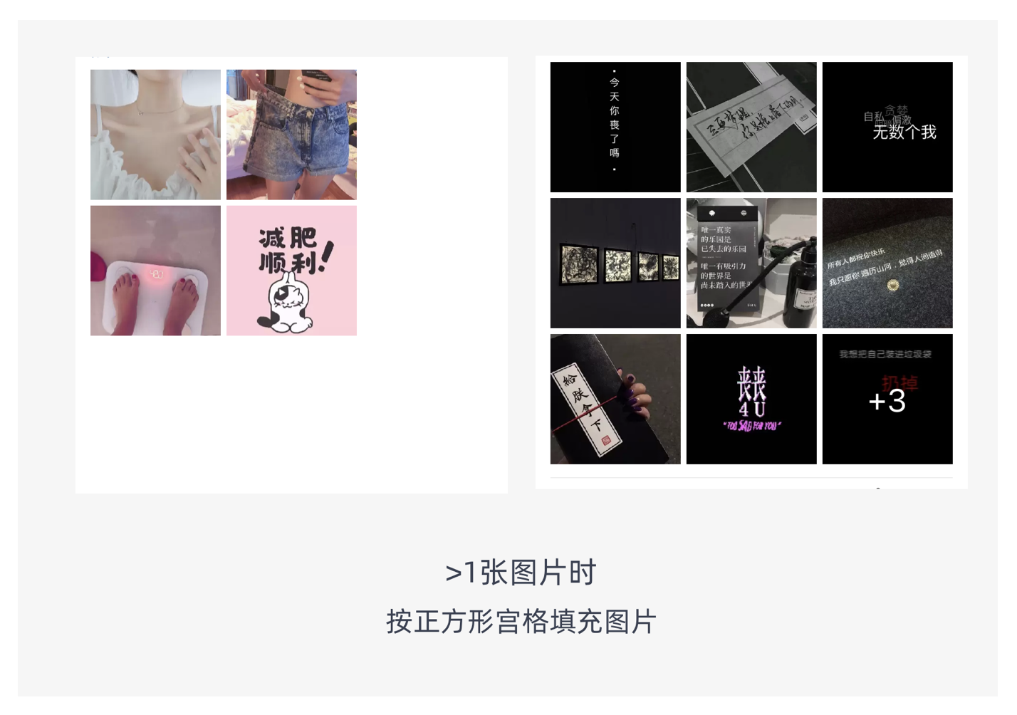 宮格式布局是指用戶上傳的圖片會適配到一個個的方格中,常見的排版有 3 宮格、6 宮格、9 宮格。它多應(yīng)用在社交類的 APP 中或者電商 APP 的內(nèi)容社區(qū),如微博、微信、QQ 空間等社交 APP,以及淘寶等電商應(yīng)用的內(nèi)容社區(qū)。