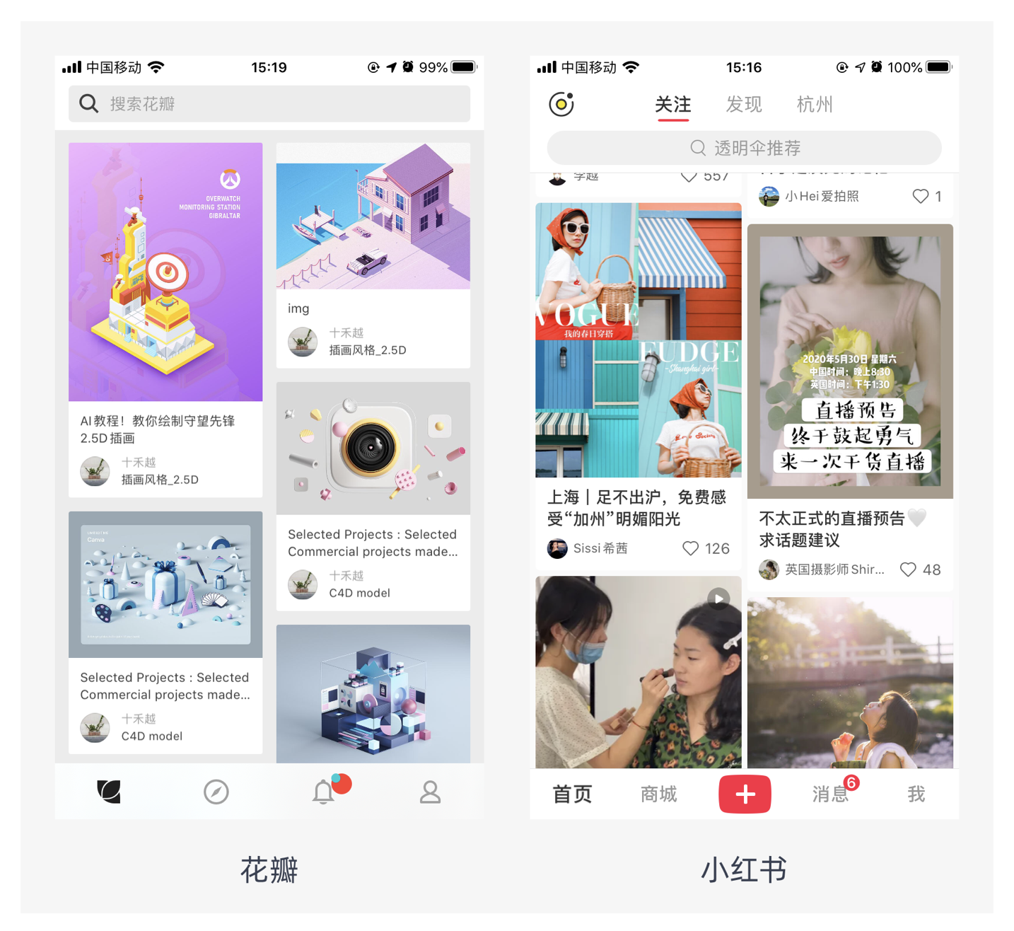瀑布流式布局的視覺表現(xiàn)為參差不齊的多欄布局,用戶的視線軌跡以 Z 型為主,這種軌跡易于閱讀。但由于用戶采用 “就近原則” 閱讀信息,容易產(chǎn)生漏讀現(xiàn)象。它適用于社區(qū)類瀏覽型頁面,這類頁面往往信息量大,采用瀑布流式布局能讓瀏覽體驗更為流暢,如花瓣、小紅書等平臺,用戶可以不斷下拉獲取更多內(nèi)容,沉浸在瀏覽過程中。