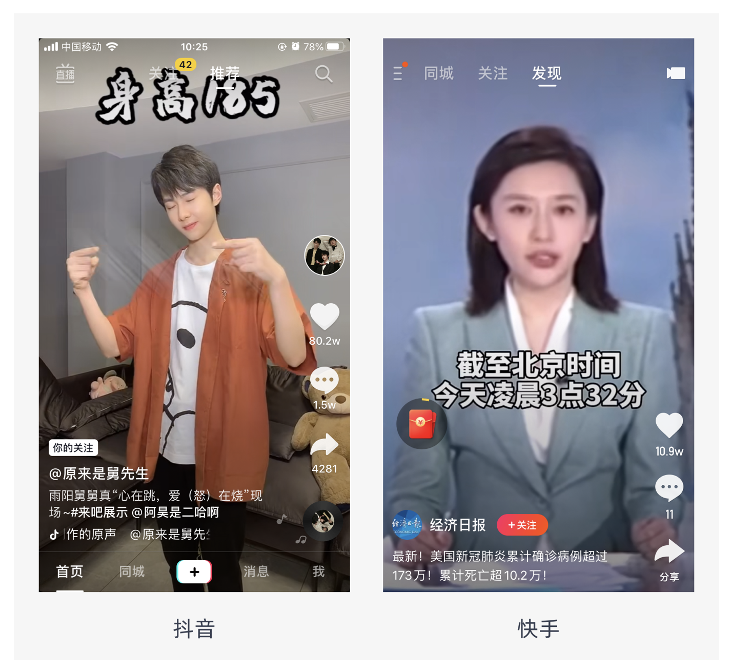 視頻性 Feed 流以短視頻為主(長視頻占用用戶時間長,容易導(dǎo)致用戶缺乏耐心),搭配輔助文字。它的優(yōu)點是能滿足用戶在視覺和聽覺上的感受,沉浸式體驗好,更加容易吸引用戶的注意力,一般情況下會主動且循環(huán)播放,畫面占滿全屏,如快手、抖音、微視等。不過,它也存在缺點,占用空間大,展示內(nèi)容少,而且需要緩存,對網(wǎng)絡(luò)質(zhì)量要求高。