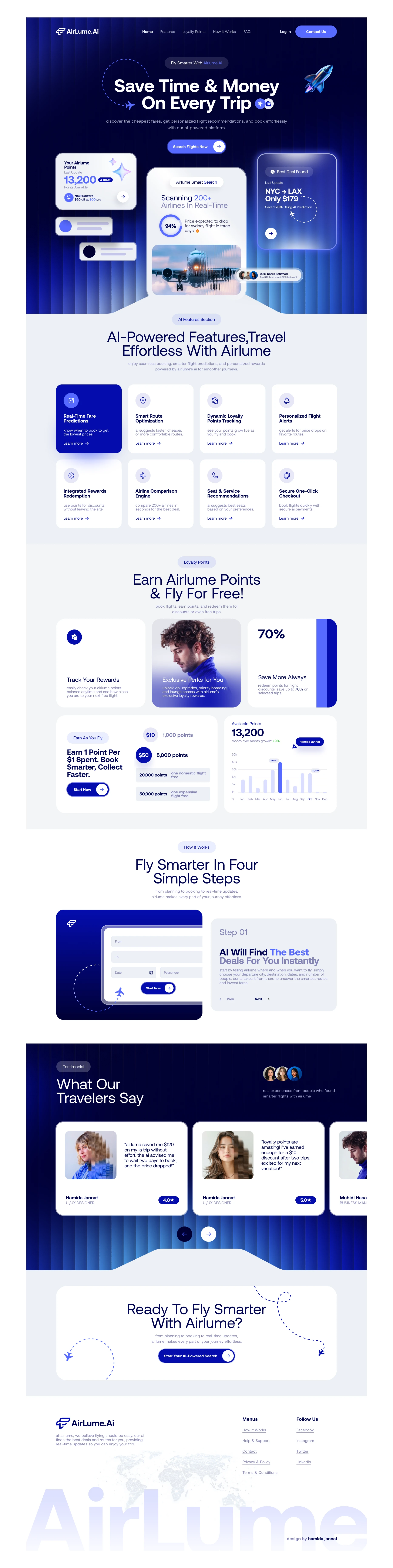 首屏(Hero Section):大標題(價值主張)+ 動效圖標(火箭)+ CTA 按鈕,立即傳達核心價值“Save Time & Money”。