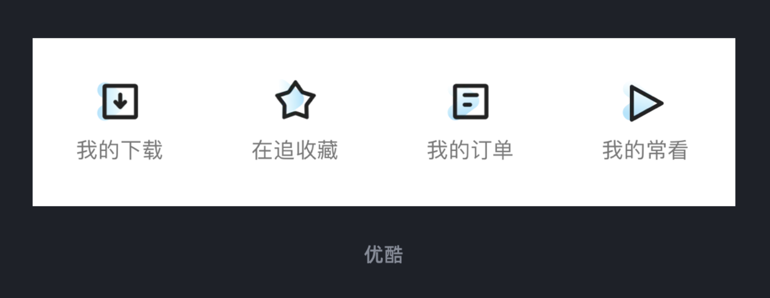比如優(yōu)酷個人中心的圖標(biāo) ——“我的下載”“我的訂單” 這些功能按鈕,都采用簡潔的線性風(fēng)格,但在圖標(biāo)的底層悄悄疊加了優(yōu)酷的品牌圖形元素。這種 “線性 + 品牌點(diǎn)綴” 的設(shè)計,既保持了界面的清爽感,又讓圖標(biāo)跳出了 “千篇一律” 的困境,用戶看到圖標(biāo)時,會下意識聯(lián)想到 “這是優(yōu)酷的設(shè)計”,慢慢形成記憶點(diǎn)。