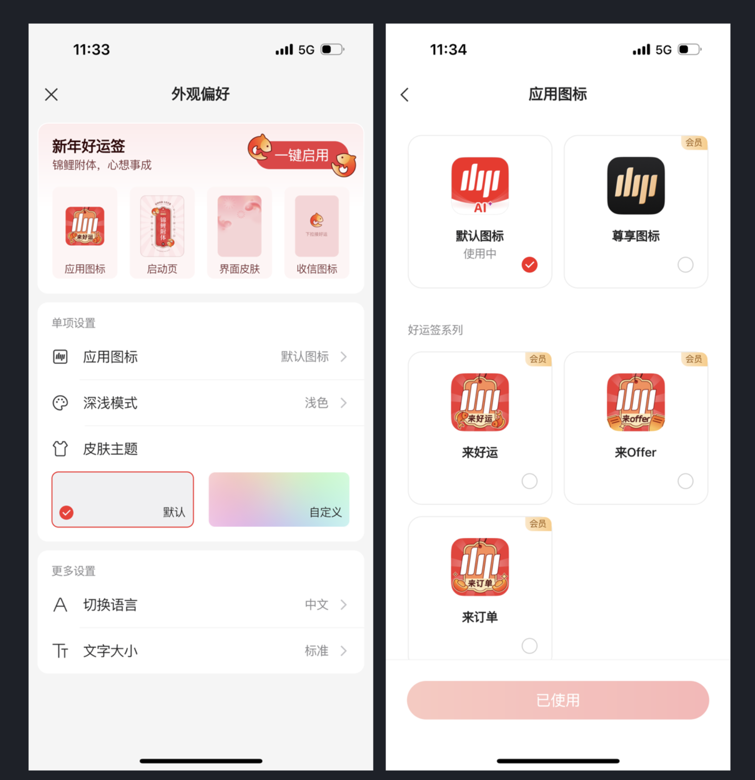 更貼心的是,這些設(shè)置都支持 “單項(xiàng)調(diào)整”—— 比如用戶只想換圖標(biāo),不用連帶改皮膚;想調(diào)文字大小,也不用重新設(shè)置模式。這種 “精細(xì)化自定義”,讓用戶感覺 “這個 APP 是為我量身定制的”,不僅降低了審美抵觸,還悄悄提升了用戶對產(chǎn)品的好感度。