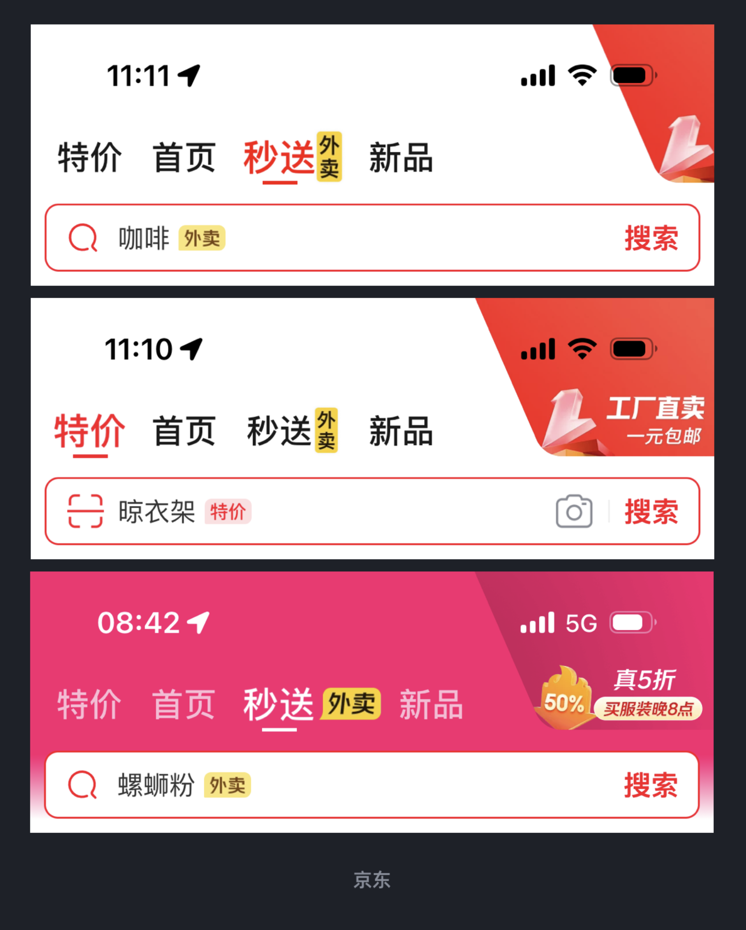 之前京東外賣還沒加入 “秒送” 欄目時,導(dǎo)航欄的布局有些失衡:左側(cè)是 “特價”“首頁” 等功能入口,右側(cè)只有搜索框,中間和右側(cè)有不少空白。后來京東把外賣業(yè)務(wù)納入 “秒送” 欄目,在導(dǎo)航欄右側(cè)加了一個 “外賣” 營銷入口 —— 這個小小的改動,不僅讓導(dǎo)航欄左右布局更對稱,還充分利用了之前的空白區(qū)域,拓展了營銷接口。用戶點(diǎn)進(jìn) “外賣” 就能直接下單,不用再從首頁層層尋找,既提升了轉(zhuǎn)化,又讓界面更規(guī)整。