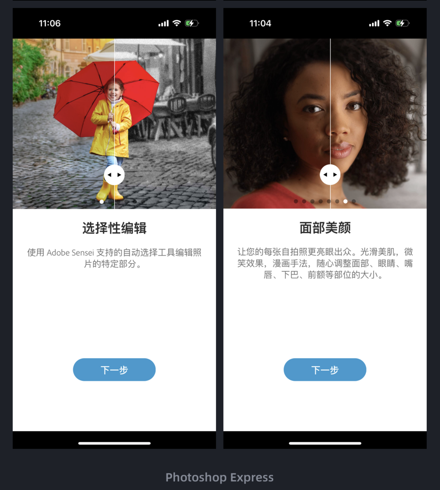 很多產(chǎn)品的引導(dǎo)頁、功能介紹,都喜歡用 “靜態(tài)圖文”,用戶看了容易忘,也感受不到功能的實(shí)際價值。但 Photoshop Express 的引導(dǎo)頁設(shè)計,卻用 “互動” 讓功能優(yōu)勢變得直觀 —— 用戶不用 “看說明”,而是 “親身體驗(yàn)”。