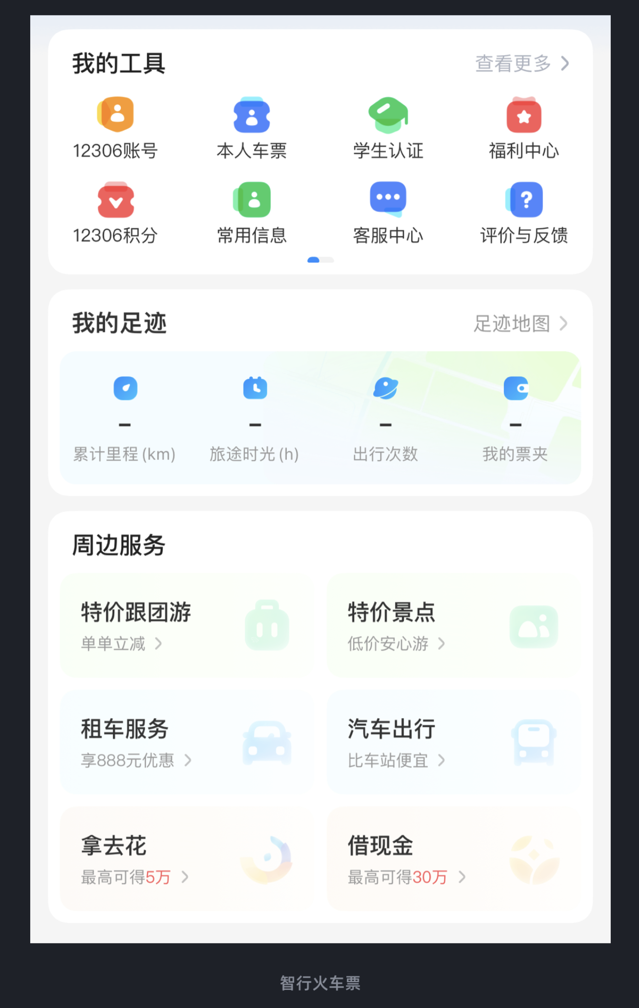 在智行火車票的個人中心里,有 “我的工具”“常用信息”“周邊服務(wù)” 三個主要版塊。其中 “我的工具”(12306 賬號、本人車票、學(xué)生認(rèn)證等)和 “常用信息”(我的足跡、我的票夾等)是用戶高頻使用的功能,所以這兩個版塊的圖標(biāo)用了 “高飽和度、低明度” 的配色,視覺張力強(qiáng),能第一時間吸引用戶的注意力;而 “周邊服務(wù)”(特價跟團(tuán)游、租車服務(wù)、拿去花等)是輔助功能,圖標(biāo)就采用了 “高明度、低飽和度” 的處理方式,顏色更淺、更柔和,視覺上故意 “弱化”。