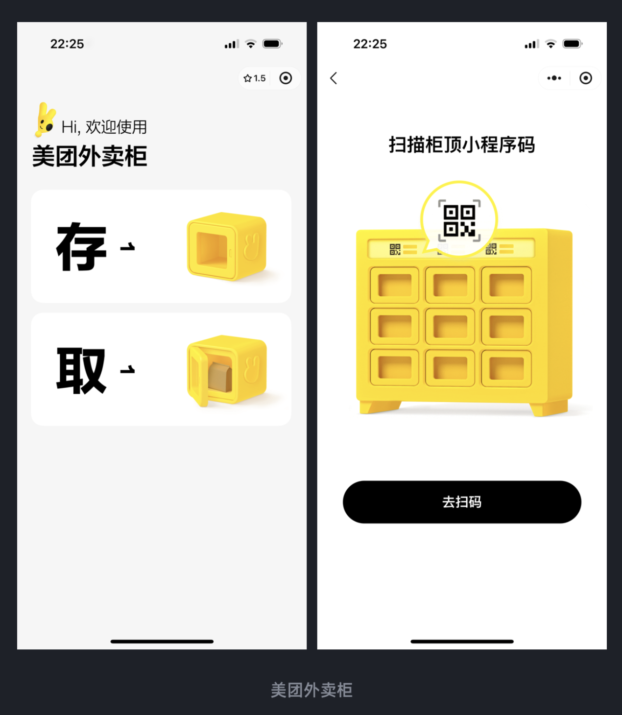 美團外賣柜小程序卻反其道而行之 —— 打開界面后,只有 “存” 和 “取” 兩個核心按鈕,搭配 “掃描柜頂小程序碼” 的簡單指引,沒有任何廣告、推薦等多余元素。