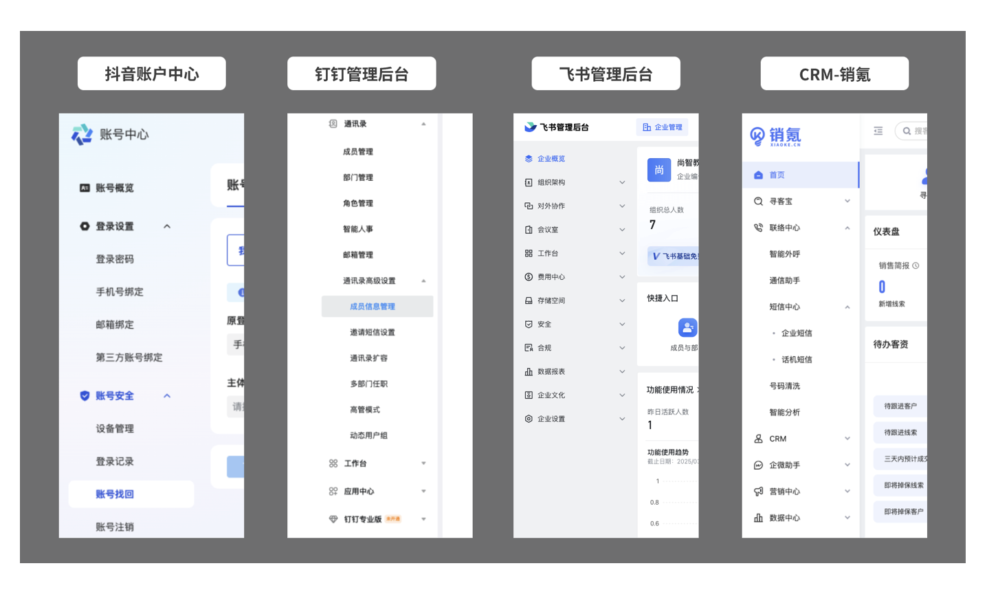 - 寬欄(混合導(dǎo)航):圖標(biāo)與文字并存,支持多級菜單嵌套,是最常見的側(cè)邊欄樣式。通過分組標(biāo)題和分割線提升信息密度,兼容性強,適合業(yè)務(wù)復(fù)雜、功能模塊較多的系統(tǒng),如抖音賬戶中心、飛書管理后臺、釘釘管理后臺等。