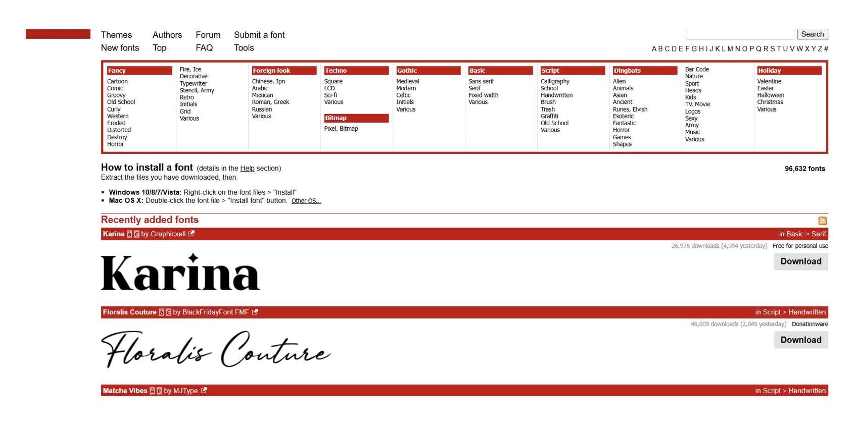 Dafont 是老牌免費字體網(wǎng)站,收錄超 4 萬款字體,風(fēng)格從經(jīng)典到怪異應(yīng)有盡有,以英文字體為主,也不乏設(shè)計師自制的創(chuàng)意中文字體。它的分類系統(tǒng)格外細致,可按主題、風(fēng)格、用途篩選,節(jié)日海報、游戲界面等特殊場景的字體需求,在這里都能找到驚喜。