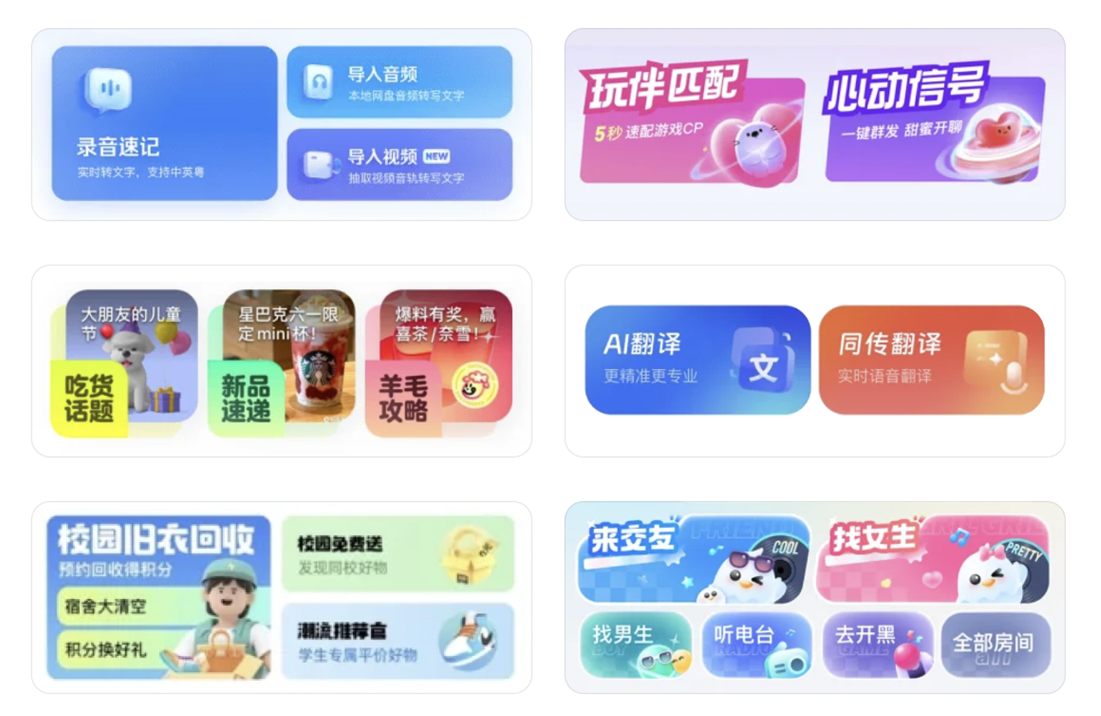 - 選1-2 個(gè)核心 / 高頻功能做大尺寸卡片,作為頁(yè)面視覺(jué)焦點(diǎn),強(qiáng)化用戶感知;