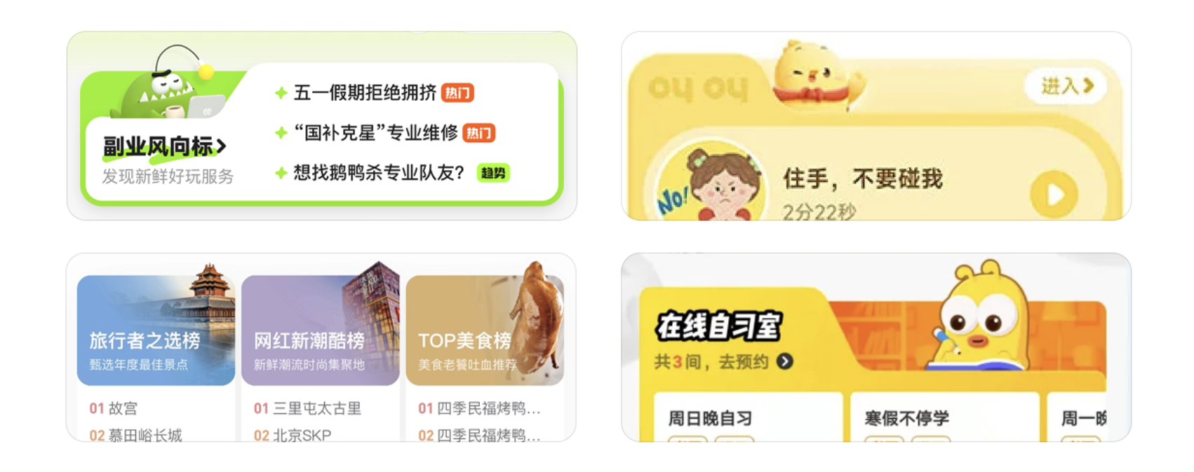 比如外賣 APP 的首頁(yè)功能區(qū),“外賣點(diǎn)餐” 是核心高頻功能,做超大卡片;“超市便利”“水果生鮮” 是次要功能,做中尺寸;“跑腿”“充值” 是輔助功能,做小尺寸。