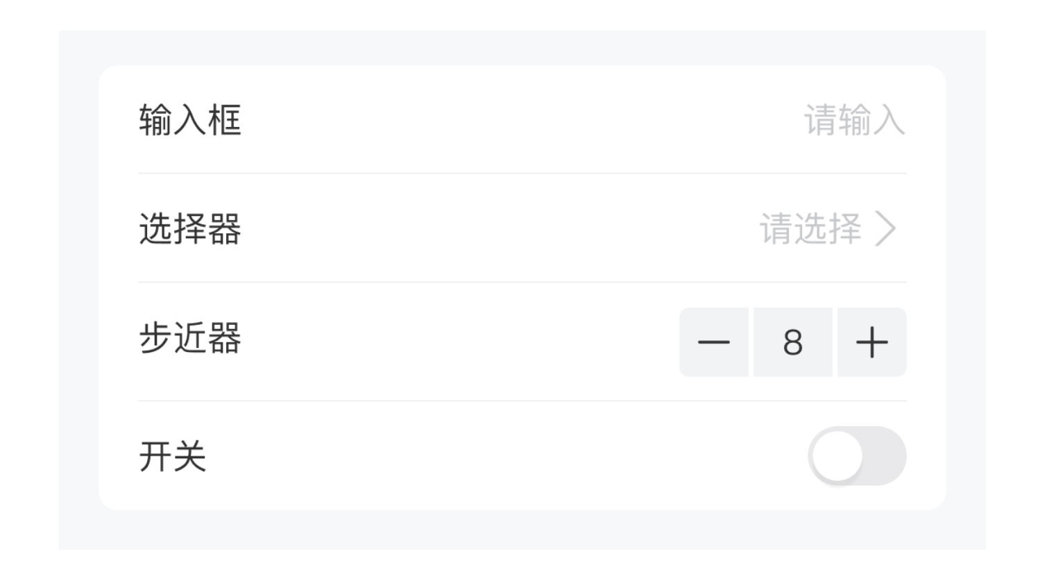 • 表單域:用戶進行輸入、選擇、勾選等操作的交互區域,如輸入框、選擇器、開關、步近器等。
