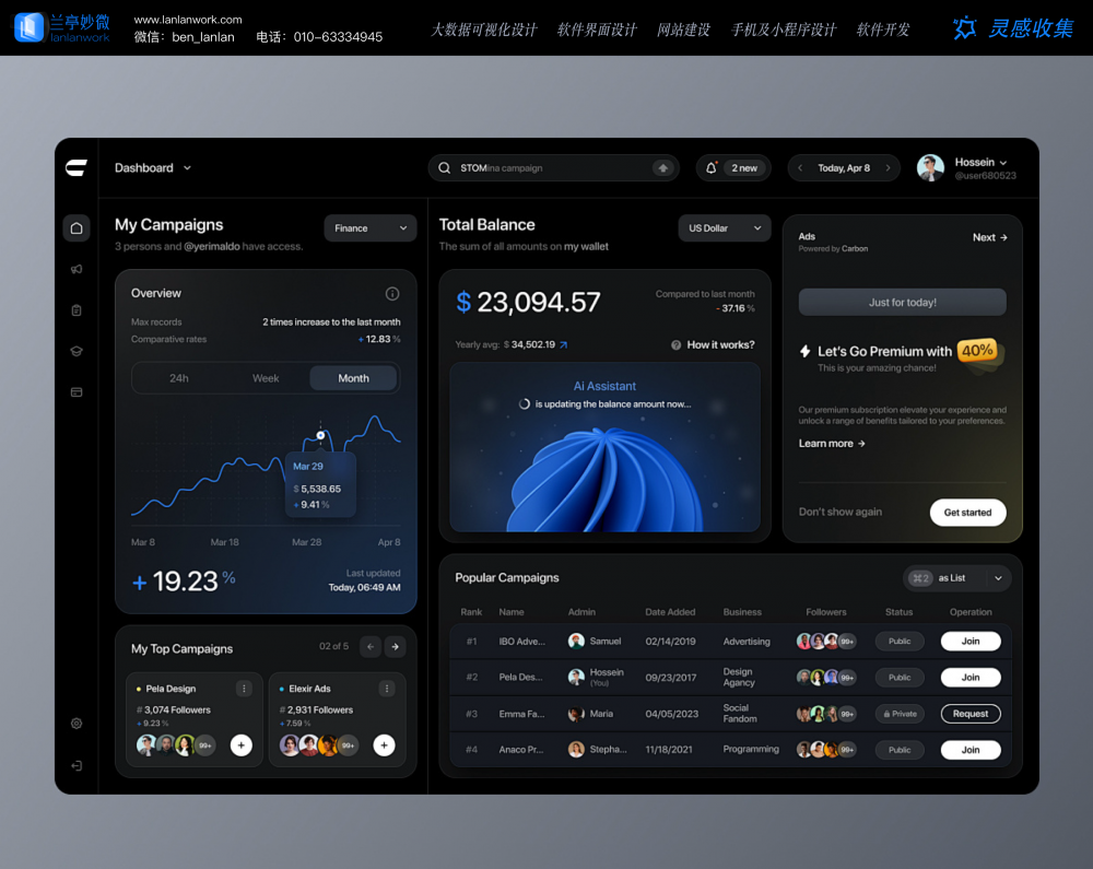 這 5 組界面都采用深色底色搭配低透明度肌理,和蘭亭妙微打造后臺管理系統(tǒng)首頁設(shè)計的思路高度契合。首圖企業(yè)服務(wù)首頁的深黑 + 淡紫漸變,既營造出科技感,又不會讓視覺過于雜亂;加密貨幣后臺的暗紋處理,貼合區(qū)塊鏈業(yè)務(wù)屬性的同時,還能讓核心數(shù)據(jù)更突出。