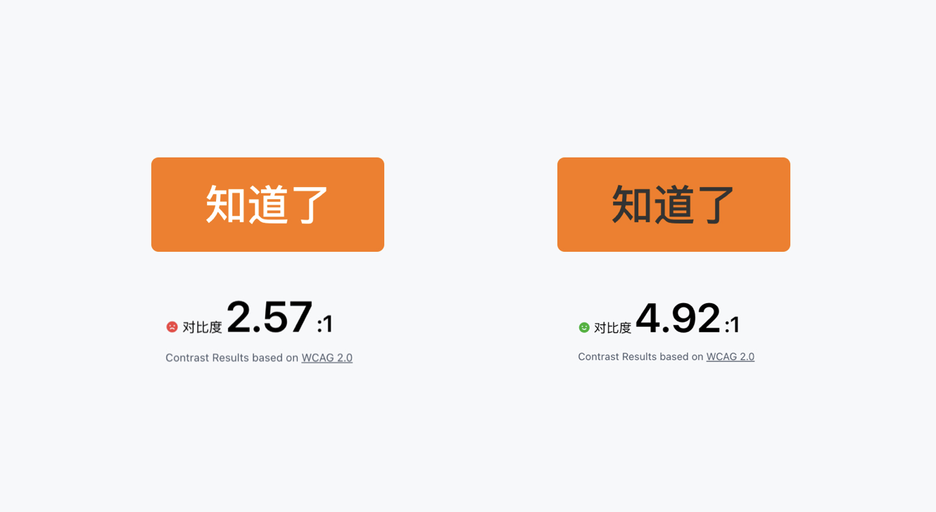 不少设计师将 WCAG Ҏ度数值奉为圭臬,认ؓ未达标的设计是不合格的。但实际场景中,法计算与用L实感知往往存在偏差。例如两个橙色背景的按钮Q黑色文本对比度 4.92:1Q符合标准)Q白色文本仅 2.57:1Q未达标准)Q可多数用户Q包括色盲群体)却反馈白色文本更易阅诅R这是因为浅色背景与白色文本的视觉融合度更高Q亮度感知的舒适度q单一Ҏ度数D定义?/div>